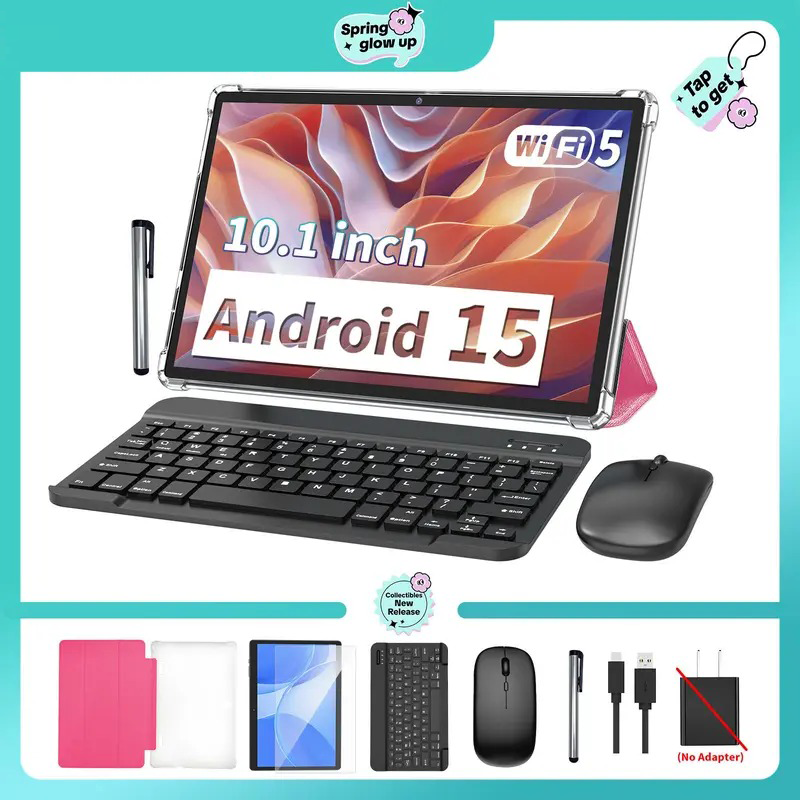 Android 15 10.1 Inch Tablet, 2 in 1 Portable Device with Keyboard, Mouse, Case, Stylus, Dual Camera